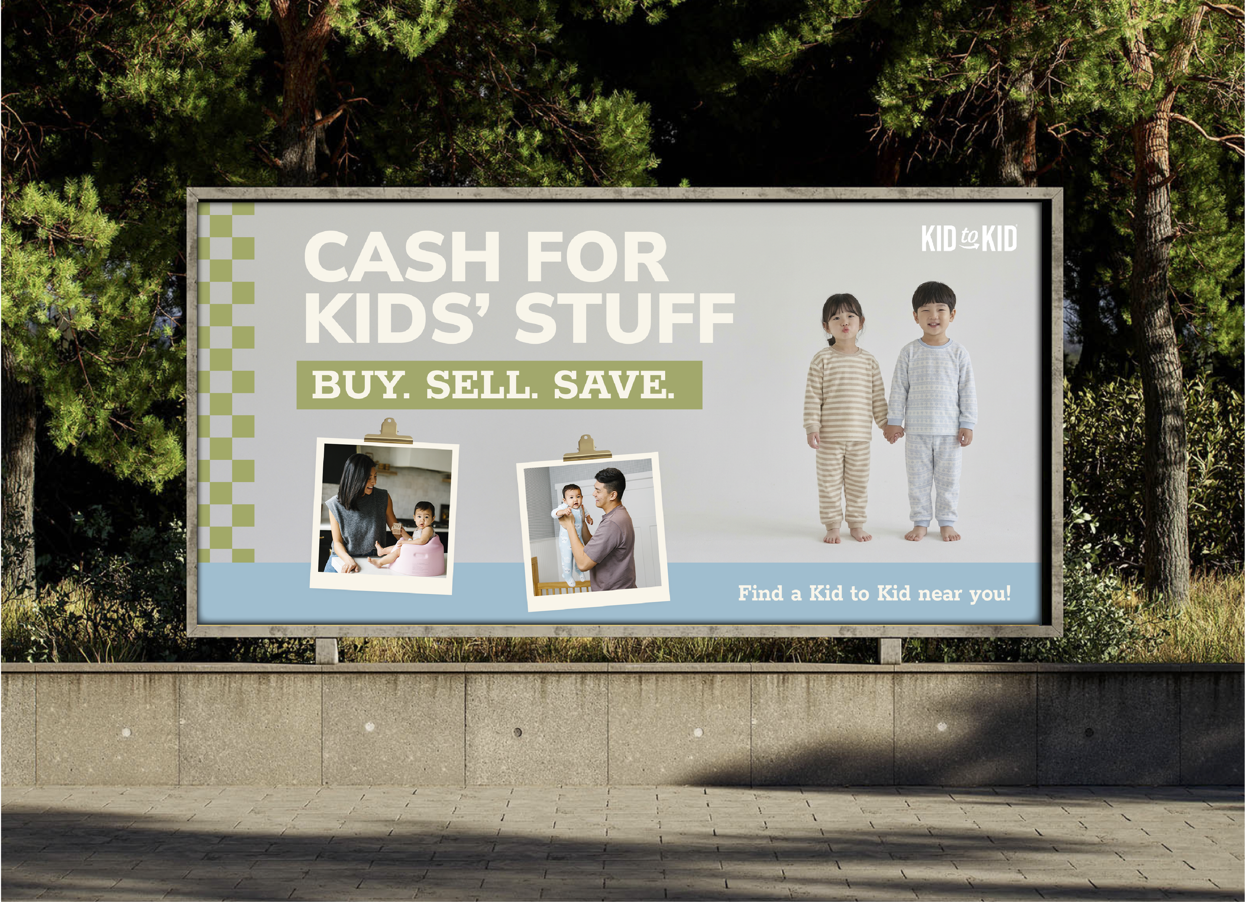 Social Media PostPosterbillboardConcept 3: Used the plain wall to make text easy to read. Branding is emphasizes through color and the underlined words, a common trait of Kid to Kid designs.
